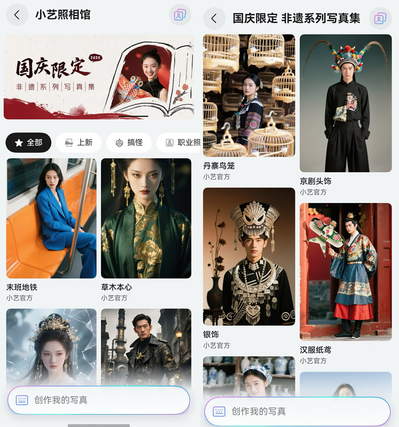 另外,對于想拍文化感滿滿的國風(fēng)影像的用戶,小藝照相館Agent上線了國慶限定非遺系列模板,進入小藝App>右下角發(fā)現(xiàn)>智能體>小藝照相館后,在國慶限定專區(qū)選擇喜歡的模板,然后就可按步驟生成高質(zhì)量的國風(fēng)寫真,打造專屬非遺系列寫真紀(jì)念冊。