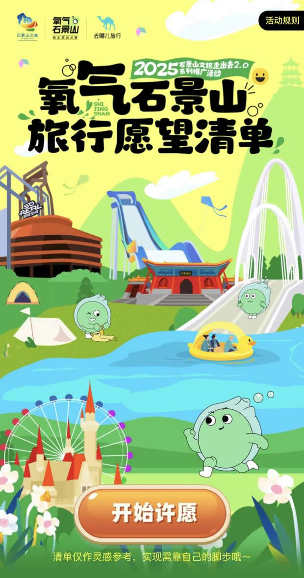 在“去哪兒”旅行APP上線“氧氣石景山”文旅專題頁,不僅整合酒店榜單、景區(qū)門票、優(yōu)質(zhì)攻略等核心文旅資源,更特別設(shè)置石景山區(qū)對口支援和協(xié)作地文旅產(chǎn)品版塊,實現(xiàn)“石景山推廣+支援地區(qū)助銷”雙重價值。同步推出的“旅行打卡愿望清單”H5,線上用戶可點亮自己的石景山旅游心愿,生成專屬旅行愿望清單;在高校路演活動中,大學(xué)生可分享H5到社交媒體作為參與活動的入場券——既為高校活動預(yù)熱,更成為高校路演入場憑證,串聯(lián)起“線上互動-線下參與”的閉環(huán)。