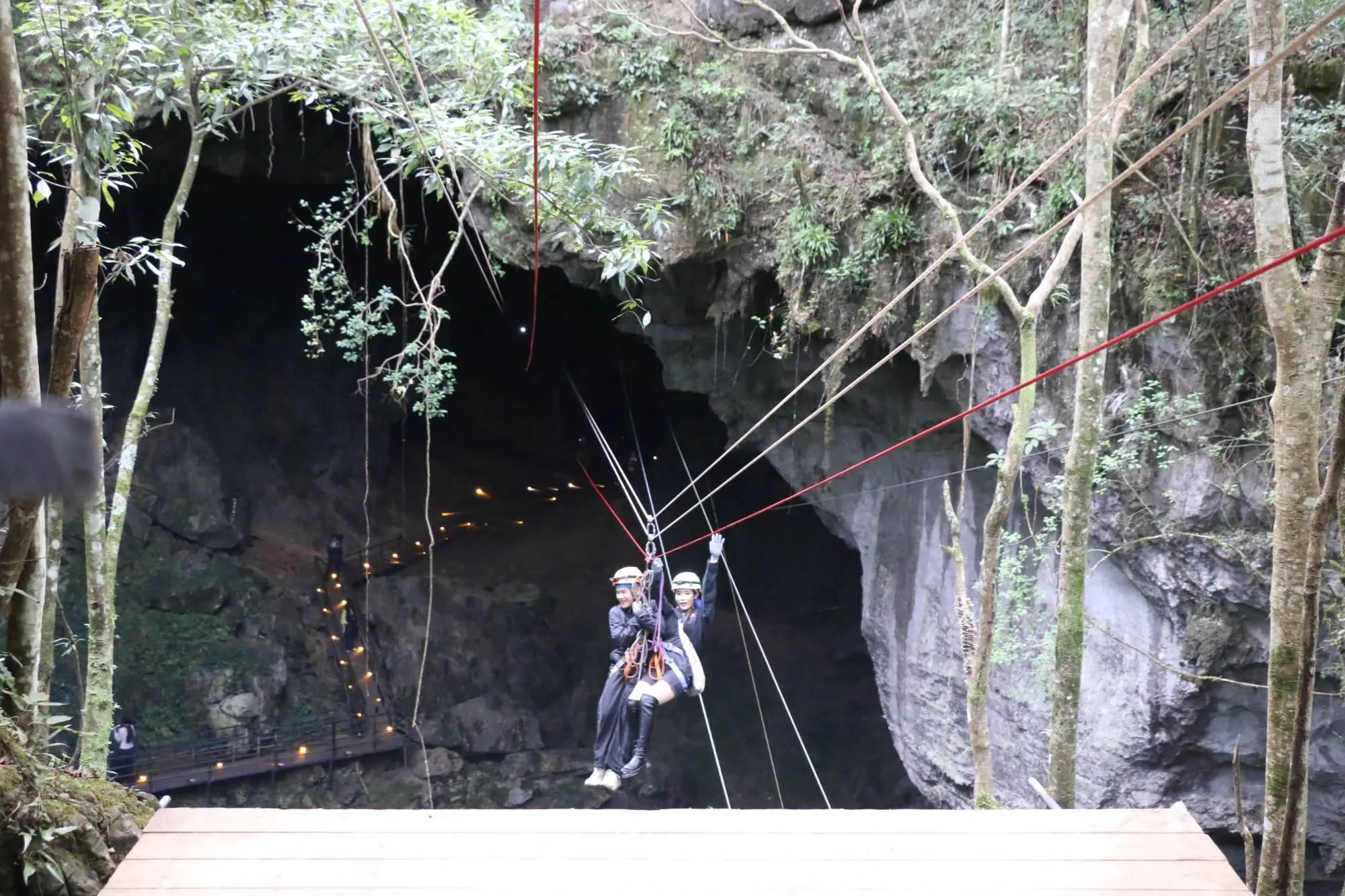 游客體驗(yàn)洞穴溜索(荔波縣融媒體中心供圖)