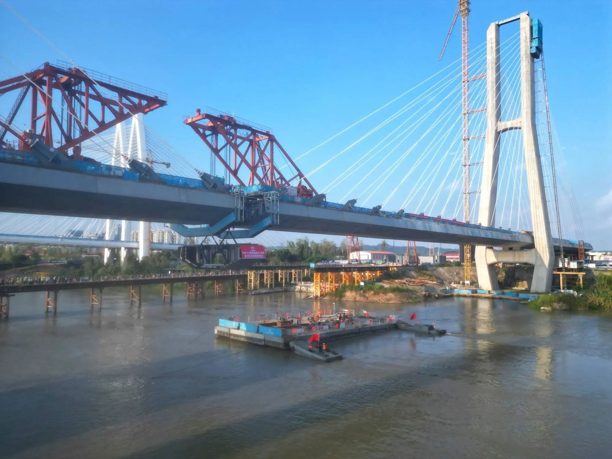 據(jù)中鐵十七局成達(dá)萬(wàn)高鐵項(xiàng)目二工區(qū)總工程師單立國(guó)介紹,由于大橋橫跨涪江,施工團(tuán)隊(duì)創(chuàng)新采用“浮運(yùn)+橋面吊裝”方案,先將鋼箱梁通過(guò)浮箱從碼頭運(yùn)輸至江心指定位置,再運(yùn)用150噸橋面吊機(jī)進(jìn)行精準(zhǔn)提升。為確保合龍精準(zhǔn)可控,項(xiàng)目團(tuán)隊(duì)提前謀劃、周密部署。針對(duì)大跨度斜拉橋合龍段受力復(fù)雜、溫度變形敏感、精度控制要求高等技術(shù)難點(diǎn),團(tuán)隊(duì)選擇夜間“溫度低、溫差小”時(shí)段進(jìn)行合龍,有效減少溫度變化引起的結(jié)構(gòu)變形,并通過(guò)線(xiàn)形監(jiān)控、勁性鎖定等關(guān)鍵技術(shù)措施,最終將線(xiàn)形精度控制在毫米級(jí)范圍,實(shí)現(xiàn)高質(zhì)量合龍。