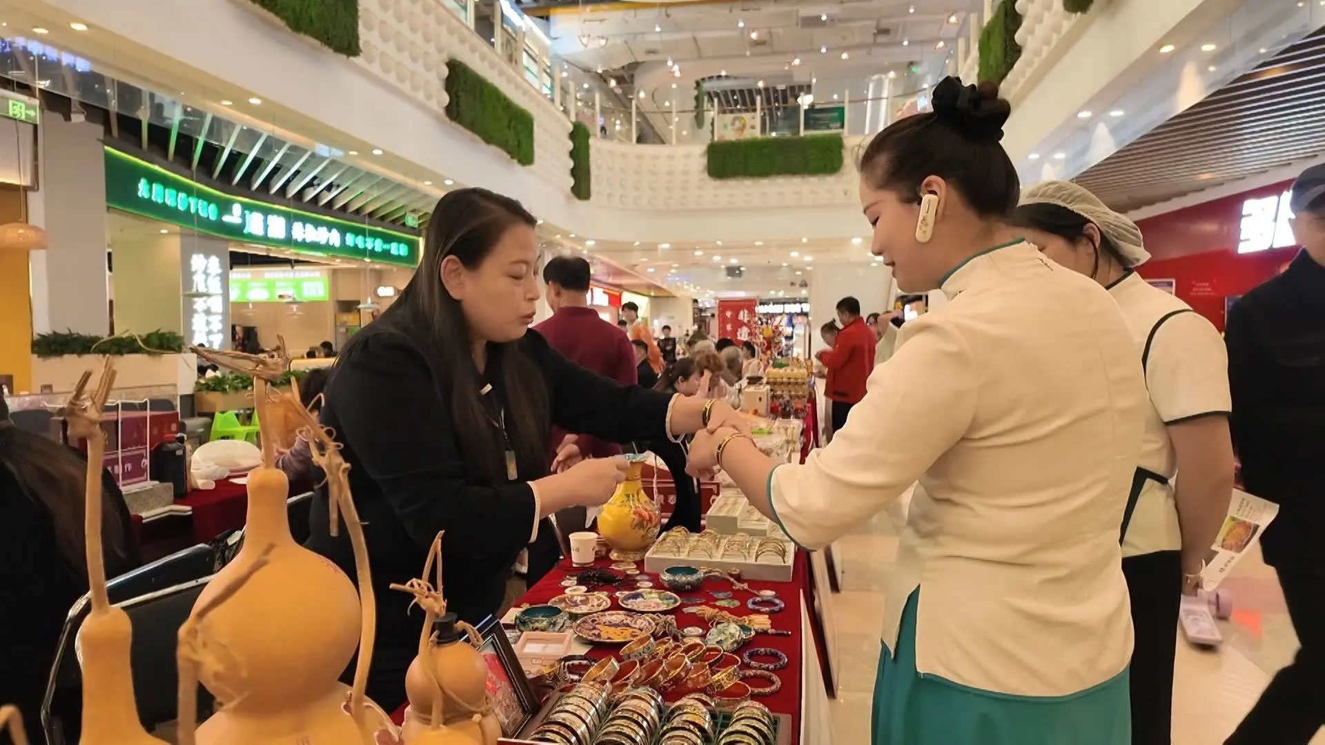在三河喬鳥(niǎo)籠的攤位前,非遺傳承人正耐心地為一位小朋友講解鳥(niǎo)籠的制作奧秘,從選料到打磨,再到微小部件的精密組裝,精湛的技藝讓充滿好奇的孩子驚嘆不已。與此同時(shí),在商場(chǎng)一樓的“守藝三河”非遺精品展示區(qū),包括鼻煙壺、三河喬鳥(niǎo)籠在內(nèi)的多項(xiàng)非遺產(chǎn)品,吸引著往來(lái)顧客的目光。