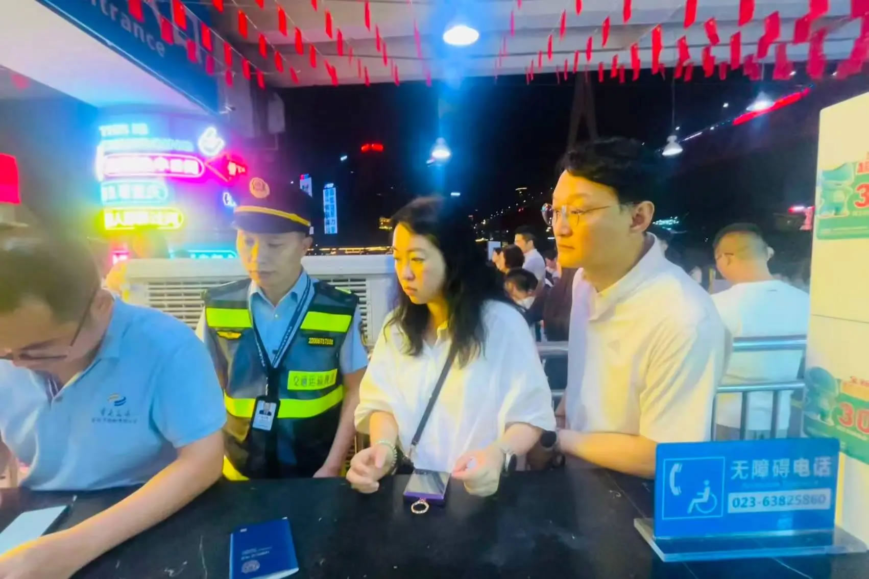 10月5日晚,兩名韓國(guó)游客因手機(jī)損壞無(wú)法出示購(gòu)票信息,向洪崖洞客運(yùn)碼頭兩江游執(zhí)法服務(wù)站求助。執(zhí)法人員一邊安撫游客,一邊協(xié)調(diào)技術(shù)人員通過(guò)后臺(tái)系統(tǒng)查詢,不到5分鐘便幫助游客順利登船。這一高效處置展現(xiàn)了服務(wù)站“事企聯(lián)動(dòng)”機(jī)制的優(yōu)勢(shì),也為外國(guó)游客留下了美好的重慶印象。