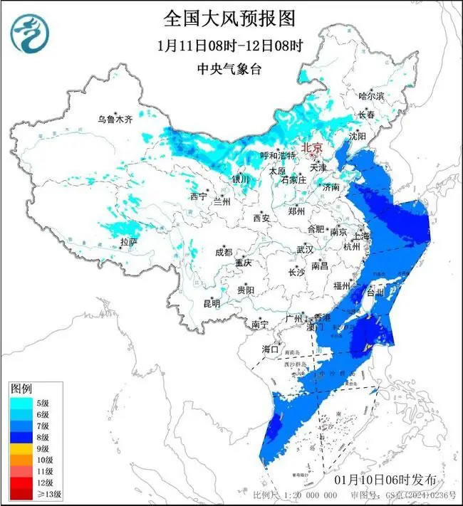 1月11日08時至12日08時,西藏中部、甘肅北部、內(nèi)蒙古中西部、寧夏北部、陜西西部、山西北部、河北北部、山東半島、遼東半島等地部分地區(qū)有5~7級大風、陣風8~9級;渤海、渤海海峽、黃海大部海域、東海大部海域、臺灣海峽、臺灣以東洋面、巴士海峽、南海東北部和中部海域、南海西南部海域?qū)⒂?~8級、陣風9~10級的大風,其中臺灣海峽、巴士海峽、南海東北部的部分海域風力可達9級、陣風10~11級。