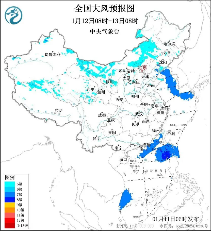 1月12日08時至13日08時,內(nèi)蒙古中西部、甘肅西部、寧夏北部、華北北部、山東半島、遼東半島等地部分地區(qū)有5~6級大風、陣風7~9級;渤海、渤海海峽、黃海大部海域、東海北部海域、臺灣海峽、巴士海峽、南海北部和西南部海域?qū)⒂?~8級、陣風9級的風。