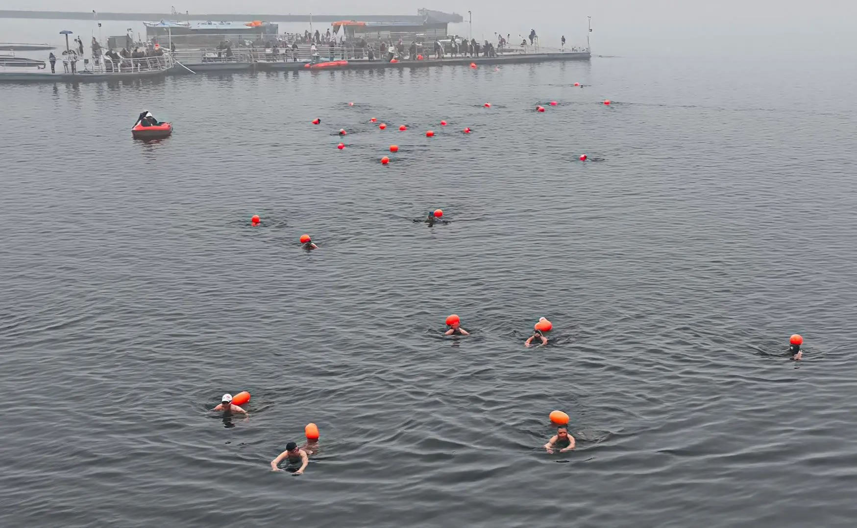 當日9時,比賽正式開始,隨著發(fā)令槍響,“泳士”們縱身躍入湖水。選手們或側泳疾馳,或蛙泳穩(wěn)進,凜冽寒風絲毫未減他們的競逐熱情。岸邊觀眾的吶喊聲、助威聲此起彼伏。