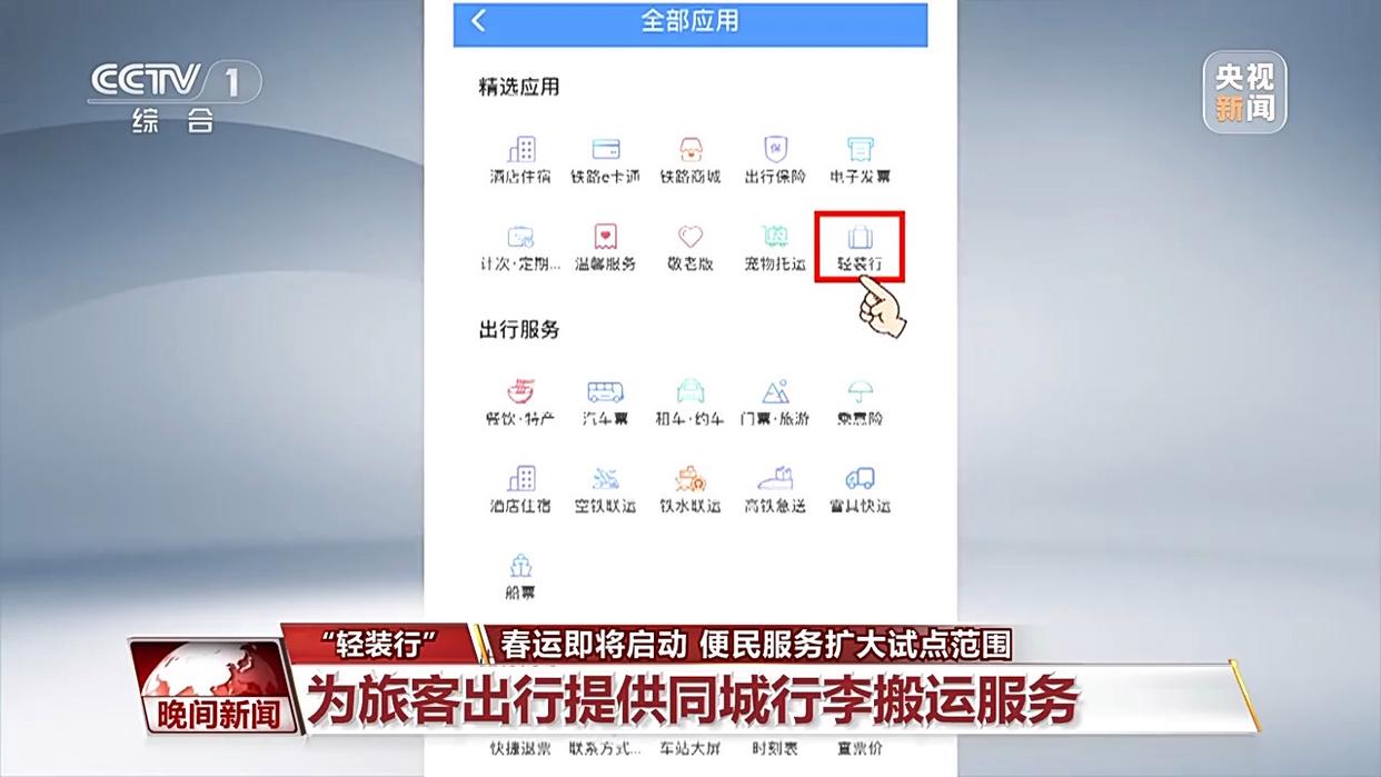 “輕裝行”是鐵路部門為旅客出行提供的“門到站”“站到門”同城行李搬運(yùn)服務(wù)。已購車票的旅客只需打開鐵路12306App或微信小程序,在首頁中部應(yīng)用欄向左滑動(dòng),找到“全部應(yīng)用”,點(diǎn)擊進(jìn)入即可找到“輕裝行”模塊,根據(jù)需求預(yù)約下單。
