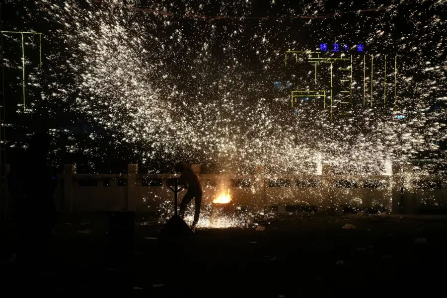 夜幕降臨,非遺打鐵花表演率先登場(chǎng)。匠人們將滾燙的鐵水奮力擊打,萬(wàn)千金花在夜空綻放,形成“火樹(shù)銀花不夜天”的壯觀景象。這門(mén)千年技藝承載著人們對(duì)風(fēng)調(diào)雨順、國(guó)泰民安的美好祈愿。