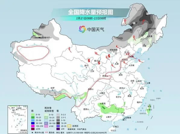 后天,內蒙古東北部、東北地區(qū)大部、新疆南疆盆地和北部、西藏東部和南部、甘肅東部、寧夏南部、山西南部等地部分地區(qū)有小到中雪或雨夾雪,其中,黑龍江北部等地部分地區(qū)有大到暴雪。西北地區(qū)東南部、黃淮西部、江漢大部、江南中西部、西南地區(qū)東部、華南北部和西部等地部分地區(qū)有小到中雨,其中,湖南西部、重慶東南部、貴州東部、廣西北部等地部分地區(qū)有大雨。