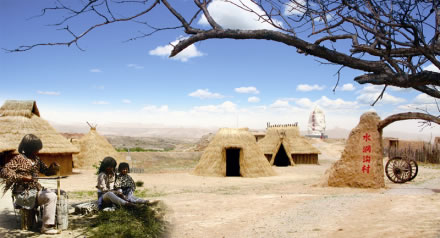 古老的水洞溝村是由北方的先民們創(chuàng)造了窖洞式和地穴式的居室方式。這種居室往往是建在黃土層較厚的山坡或溝岸上,具有冬暖夏涼的特點(diǎn)。水洞溝人在此基礎(chǔ)上改進(jìn)了這種居住方式,發(fā)展成一種半地穴式建筑形式。其方法是在黃土坡上先挖出一定深度的地穴,然后在地穴四壁確定為墻壁的地基上,用土坯(pī)壘墻,使之達(dá)到一定高度,再以桁(xíng)條,木椽搭頂,復(fù)以柴草,柴草上面糊以泥土,防止漏水。水洞溝村就是這樣一個(gè)古老的半地穴式的聚集村落遺址,我國西北地區(qū)群眾習(xí)稱其為“地窩子”。水洞溝村聚落共有29處地穴式建筑遺址,我們選擇了其中的一些進(jìn)行了恢復(fù),讓我們能夠直觀地了解先民們的居住形式。