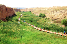 水洞溝長(zhǎng)城觀景臺(tái),是覽水洞溝大峽谷和蘆花谷美景的最佳觀賞地。站在觀景臺(tái)上,溝壑縱橫,地形獨(dú)特的土林景觀仿佛就在腳下,跌宕逶迤直達(dá)峽谷深處。整片翠綠的蘆葦蕩隨風(fēng)擺蕩,風(fēng)景蔚為壯觀;時(shí)而野鴿飛翔,紅嘴鴨叫聲四起,泉水潺潺發(fā)出聲響,匯集成溪。
