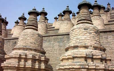 中國(guó)古代大型喇嘛塔群。在寧夏青銅峽市青銅峽水庫(kù)西岸山坡上。塔自上而下按 1、3、5、7、9……19奇數(shù)錯(cuò)落排列成12層,每層塔前用磚砌護(hù)墻一道,地面用磚鋪墁,構(gòu)成一個(gè)等邊三角形塔群,共