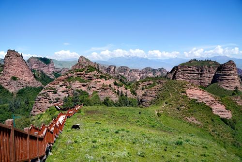 “拉毛”在藏語中是仙女的意思,“拉毛崗”在這就可理解為是仙女守望的地方。仙女們依此南望,是一派奇峰兀立、丹山優(yōu)渥的景象,她們屹立在茂密的原始森林中,隱現(xiàn)在云霧之間,匯聚成了黃河流域最大、最富有神韻的坎布拉丹霞地貌區(qū)。據(jù)統(tǒng)計,在周圍五十多平方公里范圍內(nèi),有上百座之多,占全國丹霞地貌區(qū)總面積的十分之一以上。