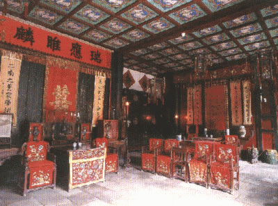 堂內(nèi)兩旁及后部陳列著正一品爵位的儀仗。如金瓜、朝天鐙、曲槍、雀槍、鉤連槍、更鼓、云牌、龍 旗、鳳旗、虎旗、傘、扇等還有一些象征其封爵和特權(quán)的紅底金字官銜牌,如