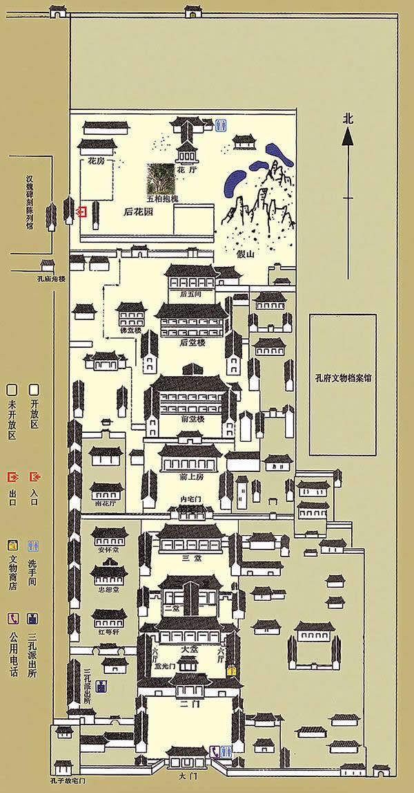 孔府占地240畝,共有廳、堂、樓、房463間。九進庭院,三路布局:東路 即東學(xué),建一貫堂、慕恩堂、孔氏家廟及作坊等;西路即西學(xué),有紅萼軒、忠恕堂、安懷堂及花廳等;孔府的主體部分在中路,前為官 衙,有三堂六廳,后為內(nèi)宅,有前上房、前后堂樓、配樓、后六間等,最后為花園。