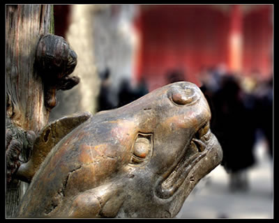 洙水橋北,先是一座綠瓦三楹的高臺(tái)大門——擋墓門,后面就到了供奉孔子木主的享殿。去享殿的甬道旁,有四對(duì)石雕,名曰華表、文豹、角端、翁仲。華表系墓前的石柱,又稱望柱;文豹,形象似豹,腋下噴火,溫順善良,用以守墓;角端,也是一種想象的怪獸,傳說日行1萬8千里,通四方語言,明外方幽遠(yuǎn)之事;翁仲,石人像,傳為秦代驍將,威震邊塞,后為對(duì)稱,雕文、武兩像,均稱翁仲,用以守墓。兩對(duì)石獸為宋宣和年間所刻,翁仲是清雍正年間刻制的,文者執(zhí)笏,武者按劍。甬道正面是享殿,殿廣5間,黃瓦 歇山頂,前后廊式木架,檐下用重昂五踩斗栱。殿內(nèi)現(xiàn)存清帝弘歷手書“謁孔林酹酒碑”,中有“教澤垂千古,泰山終未頹”等詩句。解放戰(zhàn)爭(zhēng)時(shí),朱德總司令曾在此殿內(nèi)召開過軍事會(huì)議。