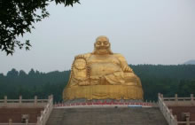 彌勒勝苑正門的牌坊高9.9米,寬12.5米,為四柱三門沖天式,整體造型莊重博大,氣勢(shì)不凡。主佛像為大肚彌勒佛,佛像通體高20米,采用3mm銅板焊接而成,花崗石質(zhì)的蓮花寶座高約9米,直徑30米,號(hào)稱“江北第一大佛 ”。佛像周圍的巖壁,雕刻了十八羅漢。主佛像身后的環(huán)形山崖上,是彌勒佛的生平事跡介紹的大型浮雕,其長(zhǎng)36米,高3.5米,面積126平方米。