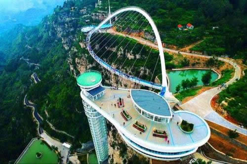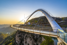 玻璃橋為無背索斜拉弧形玻璃橋,建于潭溪山海拔700米的崖壁之上,橋面跨度117米,懸空高度101米,外弧最大半徑90米,總承載可達900噸,單次承載10000人。玻璃橋整體由百米觀光電梯、懸崖酒店及玻璃橋體組成。其中,百米觀光電梯采用全景玻璃設計,依懸崖而建,集觀光、代步、游覽為一體。橋體的彩虹狀獨特造型,充滿動感與美感,且與山崖風格渾然一體。潭溪山高空玻璃橋迄今為止,潭溪山高空玻璃橋已獲得兩項國際大獎:2019年世界結構大獎——行人橋梁獎,2020年國際橋梁大會(IBC)——亞瑟·海頓獎。