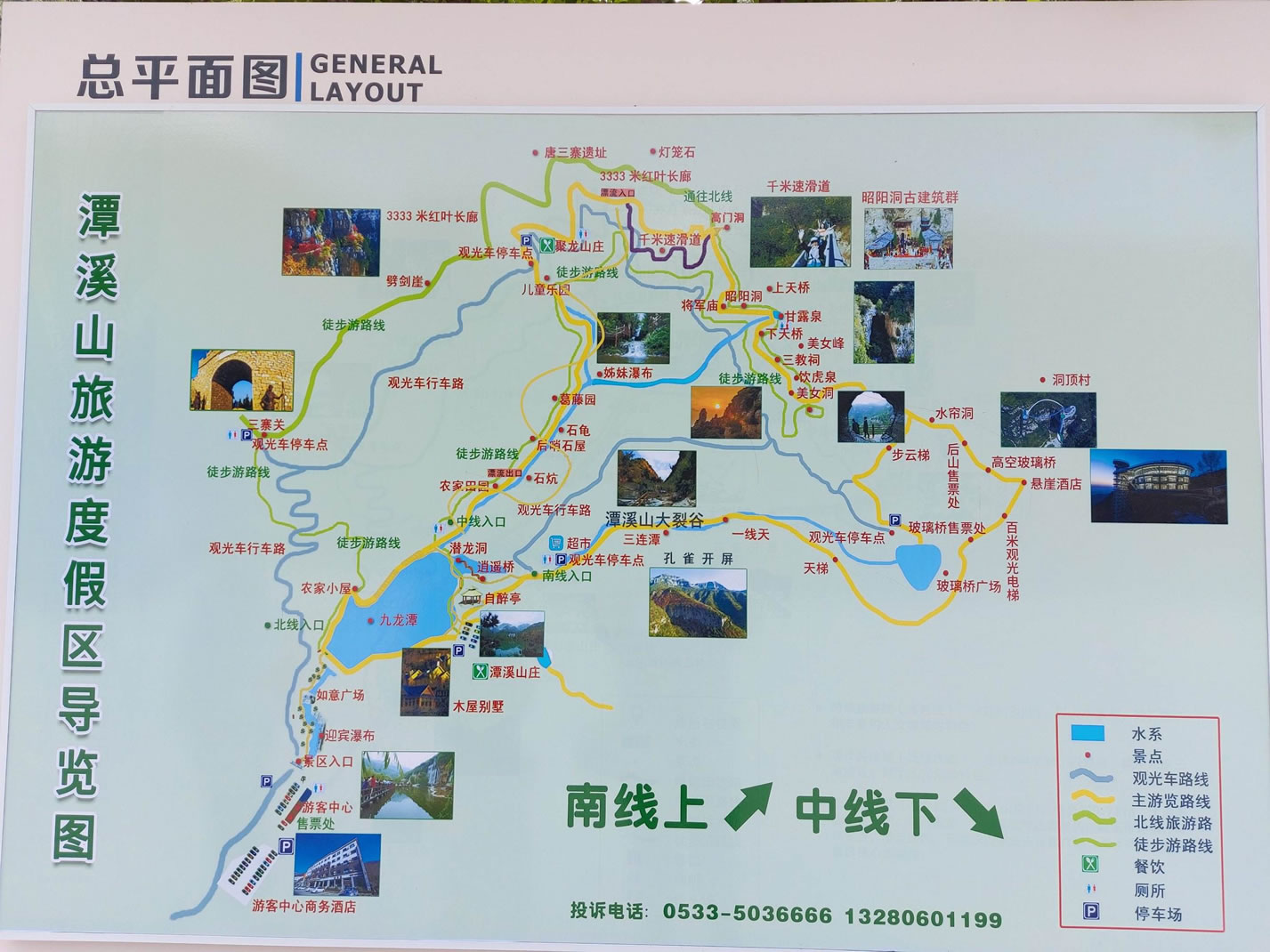 旅游南線:全程約3小時,以山水景觀、奇石怪峽和豐富的人文景觀為特色,主要景點有: 潭溪山大瀑布、如意廣場、九龍?zhí)、自醉亭、潛龍洞、逍遙橋、石臼、石壩、滄桑石屋、孔雀開屏、潭溪山大裂谷、三連潭、太子石像、一線天、較量、兄弟瀑布、石祖(生命之根)、步云梯、王小洞、百米觀光電梯、高空玻璃橋、洞頂村、星洞傳說、水簾洞、龍鳳臺、美女峰、美女洞、九龍擁翠、飲虎泉、三教祠(昭陽南洞)、仙人橋(下天橋)、甘露泉、通天洞(生命之源)、上天橋、昭陽洞(昭陽洞北洞)、將軍祠、試劍峰、高門洞、千米速滑道、空中玻璃漂流、兒童樂園,乘坐觀光車或沿旅游中線步行下山。