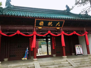 大觀樓是賈元春省親時(shí),游罷大觀園各處院落之后,與家人相聚的地方。賈元春省親,是值賈府興盛的頂峰。高十五米重檐歇山頂?shù)拇笥^樓是這組建筑群在中心,是典型的皇家苑圃。
