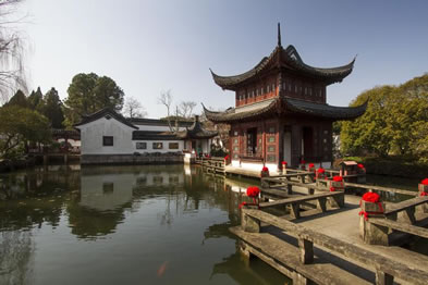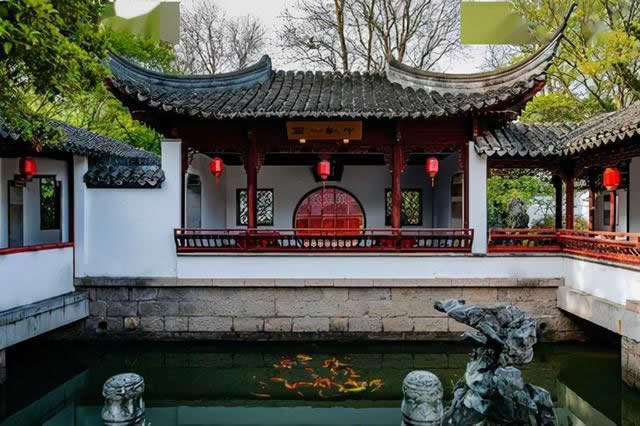 紫菱洲為賈赦之女賈迎春的居所,因她在海棠詩(shī)社中號(hào)“菱洲”。這是兩座相同式樣的建筑,中間以七曲橋連接,兩端各有三曲橋。漲水時(shí),曲橋平臥。