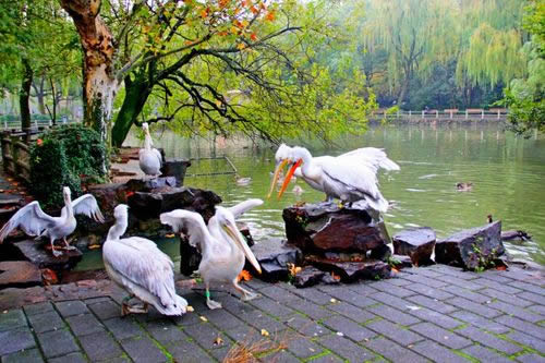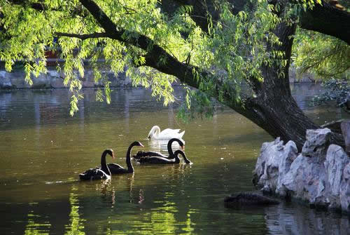 上海動物園天鵝湖建于1954年,面積近3.3公頃(近50畝),是由幾個天然水塘開挖連成的,因首先飼養(yǎng)天鵝而得名,一座三孔橋南北橫跨。湖東一座琉璃綠瓦的四角亭,與西面鴛鴦榭遙遙相對,臨水倚欄,觀賞水禽、飛鳥,尤其每天鵜鶘在上空盤旋,令人迷離神往。