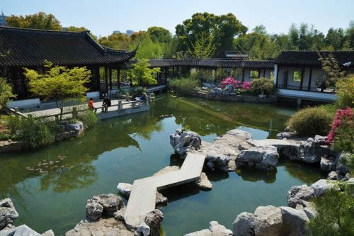 古猗園位于上海市西北郊嘉定區(qū)南翔鎮(zhèn)東,離市中心21公里。園林正門向南朝向滬宜公路,西近南翔老街、云翔寺,北聯(lián)滬嘉公路,占地面積130余畝。始建于明嘉靖年間,原名“猗園”,取自《詩經(jīng)》中“綠竹猗猗”一句。清乾隆十一年(1746年),更名“古猗園”。為上海五大古典園林之一。全園布局,主要由四面環(huán)水的兩塊島地組成。以五座平橋與兩岸連通,以一座曲橋使兩島相接。劃分為逸野堂、戲鵝池、松鶴園、青清園、鴛鴦湖、南翔壁6個景區(qū),是上海最古老的攬勝之一。