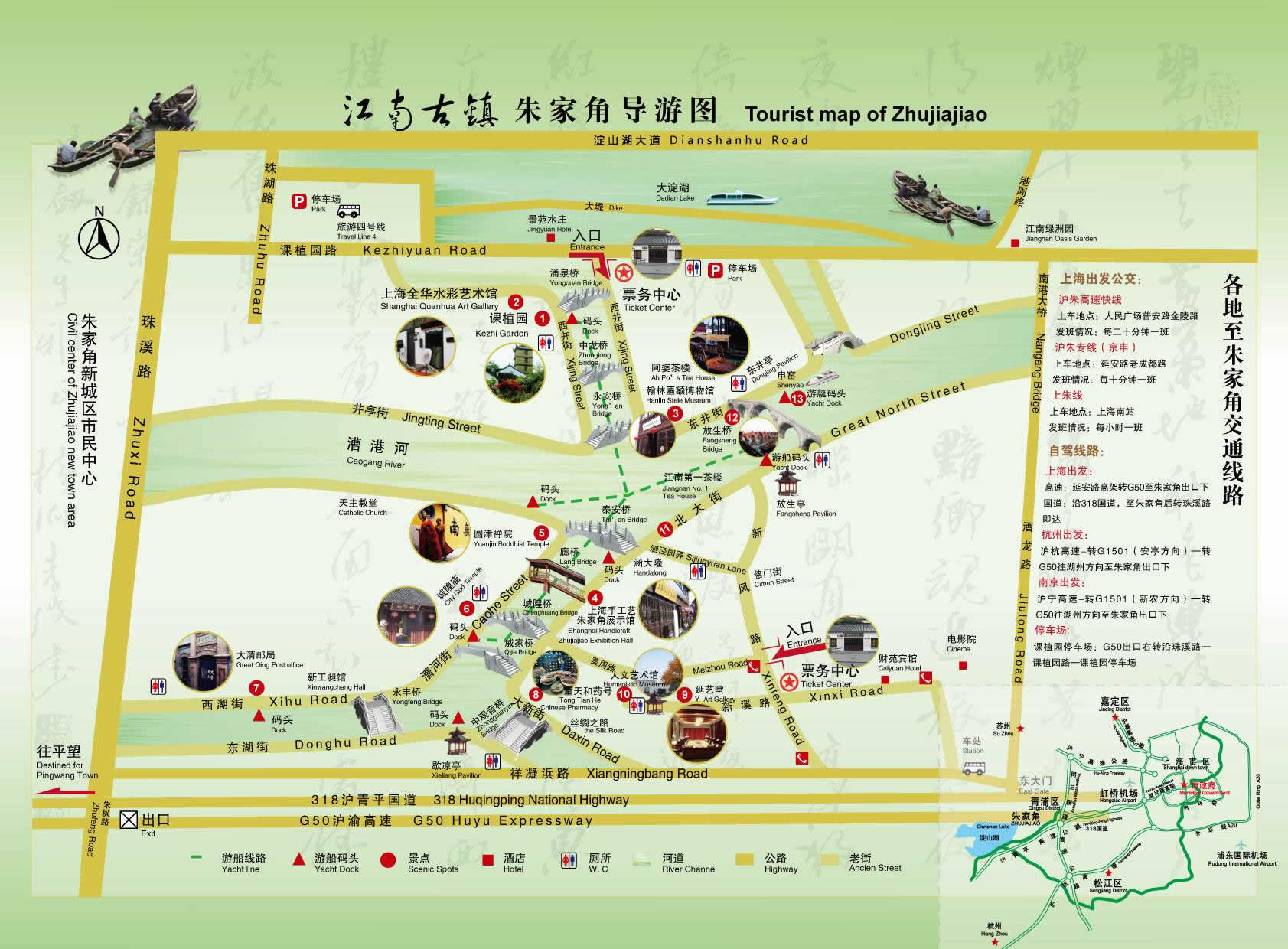 朱家角古鎮(zhèn)旅游區(qū)地處江、浙、滬二省一市交通要樞,地理位置十分優(yōu)越,東靠虹橋國(guó)際機(jī)場(chǎng),北連昆山,南接嘉興,西通平望,淀山湖下游、黃金水道漕港河穿鎮(zhèn)而過(guò)。鎮(zhèn)內(nèi)河港縱橫,九條長(zhǎng)街沿河而伸,千棟明清建筑依水而立,36座石橋古風(fēng)猶存,名勝古跡比比皆是。在玩膩了一個(gè)個(gè)雷同價(jià)高的人造景觀后,人們莫不驚訝于上海市郊還有一塊保存得如此完好的原汁原味、真山真水的天然景觀,在這里可以尋找一種回歸自然,崇尚野趣的享受。無(wú)怪乎一位同濟(jì)大學(xué)的名教授在考察朱家角古鎮(zhèn)旅游區(qū)后,不覺(jué)贊嘆:“朱家角古鎮(zhèn)旅游區(qū)有這么豐富的文化遺產(chǎn),不僅是上海一寶,也是國(guó)家的瑰寶”。臺(tái)灣著名已故作家三毛,到此曾為“小橋、流水、人家”的格局而迷戀,為清淳幽靜,處處可畫、時(shí)時(shí)有詩(shī)的風(fēng)情而陶醉。中共中央政治局委員、國(guó)務(wù)院副總理吳邦國(guó)在視察了古鎮(zhèn)朱家角古鎮(zhèn)旅游區(qū)后,不禁欣然命筆,寫下了“全國(guó)歷史名鎮(zhèn)朱家角古鎮(zhèn)旅游區(qū)”幾個(gè)大字。