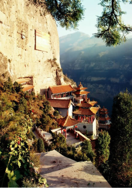 2、抱腹巖的山勢奇特為天下"絕無僅有"。它高60米,寬180米,深50米?梢员Ф儆嚅g殿宇館舍及一兩萬名游人于其中。驚險(xiǎn)壯觀的巖下飛空掛鈴,更為一絕。