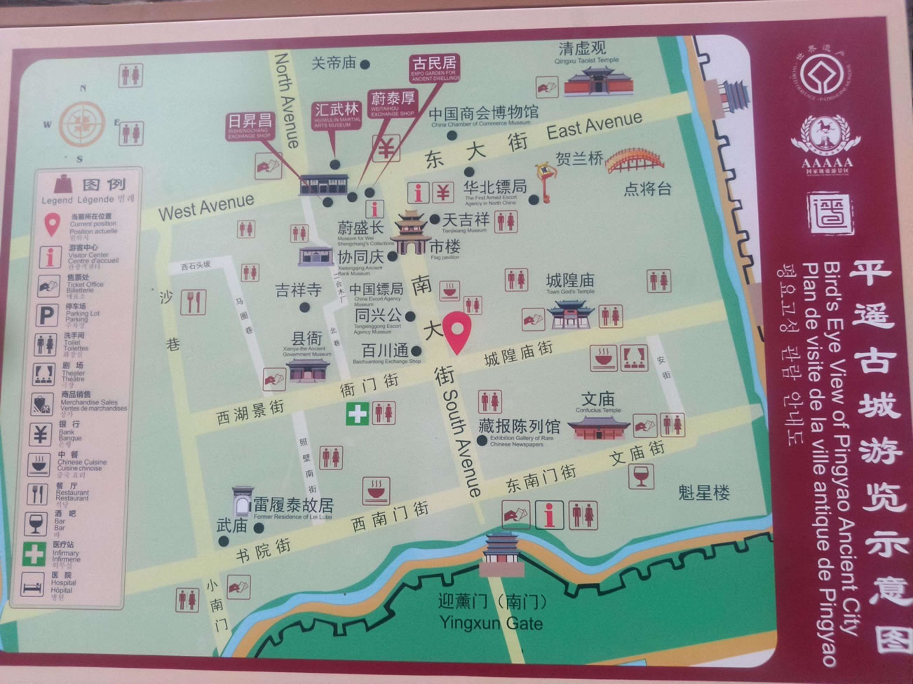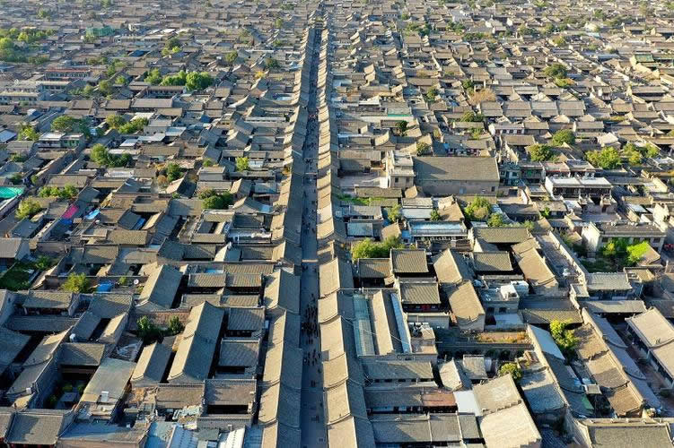 平遙古城以南大街為主軸線,以街心的市樓為至高點(diǎn),城隍、衙署擇高處而立,一東一西,對(duì)稱分布,表達(dá)了封建統(tǒng)治者“人神共治”的愿望。大型的宗教建筑設(shè)置在城市交通干道的兩端。全城四大街、八小街、七十二條小巷道,經(jīng)緯交織,主次分明 。市井商鋪林立,店面相連。古民居鱗次櫛比,院落重重,宅院(包括商鋪)建筑中軸強(qiáng)烈,對(duì)稱嚴(yán)謹(jǐn),從房舍的配置上體現(xiàn)出長(zhǎng)幼有序、尊卑有別的封建倫理觀念。
