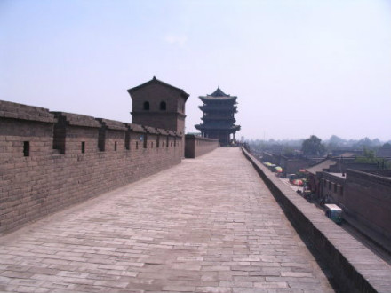 康熙四十三年(1703年)因皇帝西巡路經(jīng)平遙,而筑了四面大城樓,使城池更加壯觀。平遙城墻總周長(zhǎng)6163米,墻高約12米,把面積約2.25平方公里的平遙縣城一隔為兩個(gè)風(fēng)格迥異的世界。