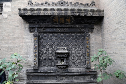 喬家大院大門坐西向東,為拱形門洞,上有高大的頂樓,頂樓正中懸掛著山西巡撫受慈禧太后面喻而贈(zèng)送的匾額,上書(shū)“福種瑯環(huán)”四個(gè)大字。黑漆大門扇上裝有一對(duì)椒圖獸街大銅環(huán),并鑲嵌著銅底板對(duì)聯(lián)一付:“子孫賢,族將大;兄弟睦,家之肥。”字里行間透露著喬在中堂主人的希望和追求,也許正是遵循這樣的治家之道,喬在中堂經(jīng)過(guò)連續(xù)幾代人的努力,達(dá)到了后來(lái)人丁興旺、家資萬(wàn)貫的輝煌。大門頂端正中嵌青石一塊,上書(shū)“古風(fēng)”。大門對(duì)面的掩壁上,刻有磚雕“百壽圖”,一字一個(gè)樣,字字有風(fēng)采。百壽圖為“在中堂”主人喬致庸的孫婿、近代著名學(xué)者、篆書(shū)家常贊春書(shū)寫(xiě)。掩壁兩旁是清朝大臣左宗棠題贈(zèng)的一付意味深長(zhǎng)的篆體楹聯(lián):“損人欲以復(fù)天理,蓄道德而能文章!遍侯~是“履和”。甬道的西盡頭處是雕龍畫(huà)棟的喬氏祠堂,與大門遙相對(duì)應(yīng)。祠堂裝點(diǎn)得十分講究,三級(jí)臺(tái)階,廟宇結(jié)構(gòu),以獅子頭柱,漢白玉石雕,壽字扶欄,通天欞門木雕夾扇。出檐以四條柱子承頂,柱頭有玉樹(shù)交榮、蘭馨桂馥、藤羅繞松的鏤空木雕。額頭有匾,上書(shū)“仁周義溥”四字,李鴻章所題。祠堂里原陳列著木刻精雕的三層祖先牌位。