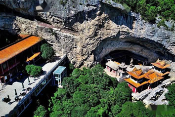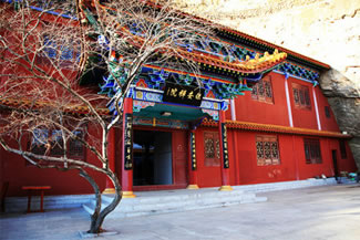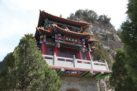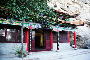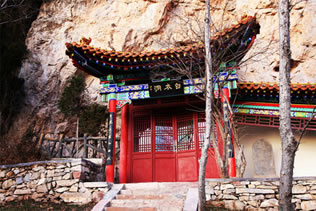 龍王洞在天竺寺景區(qū),位于石膏山上巖溶洞之東側(cè),洞高5米,寬8米,深10米許,洞內(nèi)建龍王祠。龍王祠面闊一間。洞前辟有四級平臺,紅條石漫地,松柏間植,環(huán)境幽雅。洞東通一小洞,深不可測,洞口壁上有赭紅字跡“龍水宮”;洞內(nèi)泉水汩汩而出,清澈異常。洞外崖壁石縫間平生一株山桃,主桿直徑不過10厘米,貼地生出百十根分枝,呈扇面狀。“扇面”有3米多長、2米多寬。每逢陽春三月,滿樹桃花盛開,有如鳳凰展翅。這就是石膏山古景之一的“龍鳳呈祥”。 |