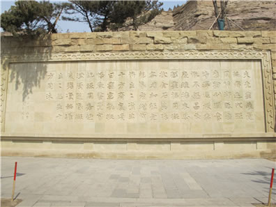 位于云岡石窟一窟山門(mén)前的“比丘尼曇媚造像記”石刻,為公元503年(景明四年)的題記。此碑刻有文字110個(gè),再現(xiàn)了當(dāng)時(shí)的社會(huì)背景,表達(dá)了發(fā)愿人比丘尼曇媚對(duì)佛教的高度信仰與虔誠(chéng)以及希望佛教振興發(fā)展的愿望,文筆優(yōu)美,堪稱(chēng)佛教發(fā)愿文之最。此碑也向我們展示了北魏時(shí)期一種特有的字體。因這種字體在當(dāng)時(shí)多用于碑文,所以后人稱(chēng)它為魏碑體。魏碑字體外方內(nèi)圓、拙樸有力,是隸書(shū)向楷書(shū)過(guò)渡的字體。由此看來(lái),魏碑書(shū)法應(yīng)是北魏平城時(shí)的創(chuàng)造。原物很小,只有30厘米高,28厘米寬,于1956年20窟前考古發(fā)掘,現(xiàn)存于云岡博物館中。