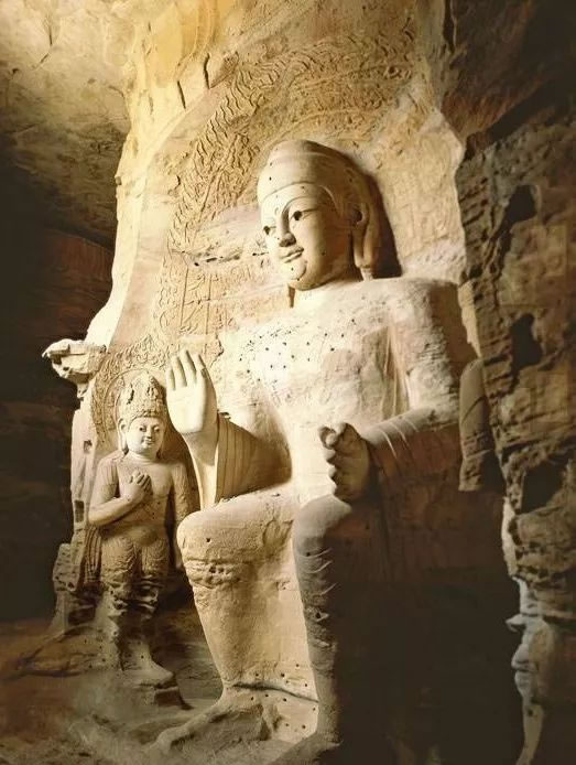 第19窟主佛像結(jié)跏趺坐,佛像耳輪齊肩,下頜崩毀,著袒右肩袈裟,輕薄貼體,衣紋簡(jiǎn)潔明快。佛像右手舉胸施無(wú)畏印,左手掌心向上握法衣于膝上,以表達(dá)佛法的無(wú)畏與傳承?咄鈻|西耳洞中,各雕刻一尊倚坐佛像,西耳洞佛像,耳廓寬大垂肩,體魄挺拔勁健。這種分窟安置三世佛的布局設(shè)計(jì),既有變化,又顯莊嚴(yán),是北朝石窟形制的新創(chuàng)舉。
