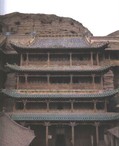 第5窟位于云岡石窟群中部,與第6窟是一組統(tǒng)一設(shè)計(jì)、建造的雙窟,屬于云岡中期洞窟?咄飧饔幸蛔屙樦伟四昙由w的四層五間式木構(gòu)閣樓,清代號(hào)稱(chēng)“云岡佛閣”或“石窟摩云”,為云中八景之一。這對(duì)豎式設(shè)計(jì)的雙子佛閣,既亭亭玉立,又合璧莊重,體現(xiàn)了我們祖先工匠對(duì)石窟寺殿宇的精準(zhǔn)理解,也是目前云岡石窟僅存的古代窟檐建筑。它除了具有佛殿功能外,同時(shí)還起到遮風(fēng)擋雨作用,特別是保持了窟內(nèi)溫濕度的相對(duì)恒定,使得第5、6窟的造像雕刻保存狀態(tài)遠(yuǎn)優(yōu)于其它無(wú)窟檐的洞窟。