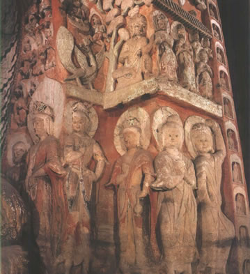 洞窟內(nèi)三級(jí)方形浮屠塔居中,塔面上刻出瓦筒、檐椽、斗拱等仿木建筑構(gòu)件,層層瓦壟出檐,上層四角鏤空雕刻八角棱柱,形成了周匝回廊,為研究北魏建筑提供了實(shí)物依。