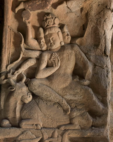 窟門(mén)拱頂正中雕一朵團(tuán)蓮,四周飛天起舞。內(nèi)側(cè)上拱邊框?yàn)檫B續(xù)排列的忍冬葉,周?chē)窦繕?lè)天人。拱內(nèi)側(cè)壁分為上下層,下層為天王門(mén)神,逆發(fā)胡人形象,手持金剛杵或三叉戟。上層雕出多頭多臂神像,東壁雕三頭四臂,西壁雕三頭六臂。