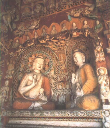 后室北壁頂部三角紋帶雕刻之下有上、下兩層大龕,下龕為圓拱龕,高4米,龕內(nèi)雕坐佛。上龕為盝形帷幕龕,龕內(nèi)中央為倚坐佛,兩側(cè)各有一交腳菩薩,最外兩側(cè)為思惟菩薩。龕楣十二格內(nèi)各雕一身飛天,龕楣上方雕有十四身伎樂(lè)天。