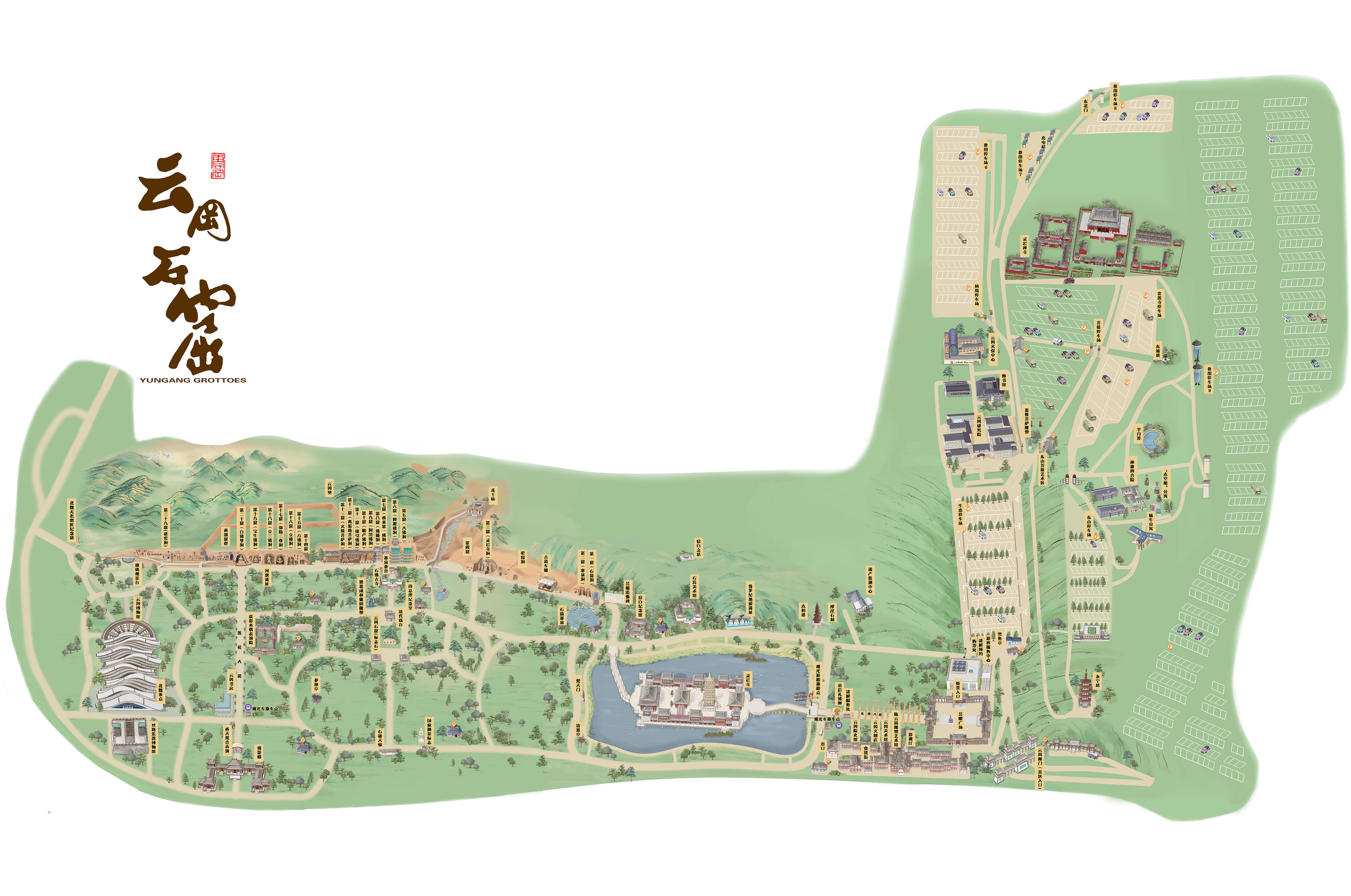云岡石窟位于中國(guó)山西省大同市城西約16公里的武州(周)山南麓、武州川的北岸。石窟依山開(kāi)鑿,規(guī)模恢弘、氣勢(shì)雄渾,東西綿延約1公里,窟區(qū)自東而西依自然山勢(shì)分為東、中、西三區(qū),F(xiàn)存主要洞窟45個(gè),附屬洞窟209個(gè),雕刻面積達(dá)18000余平方米。造像最高為17米,最小為2厘米,佛龕約計(jì)1100多個(gè),大小造像59000余尊。云岡石窟距今已有1500年的歷史,是佛教藝術(shù)東傳中國(guó)后,第一次由一個(gè)民族用一個(gè)朝代雕作而成皇家風(fēng)范的佛教藝術(shù)寶庫(kù),是公元5世紀(jì)中西文化融合的歷史豐碑。1961年3月被國(guó)務(wù)院公布為首批全國(guó)重點(diǎn)文物保護(hù)單位;2001年12月被聯(lián)合國(guó)教科文組織批準(zhǔn)列入“世界文化遺產(chǎn)”名錄;2007年5月成為國(guó)家首批5A級(jí)旅游景區(qū)。