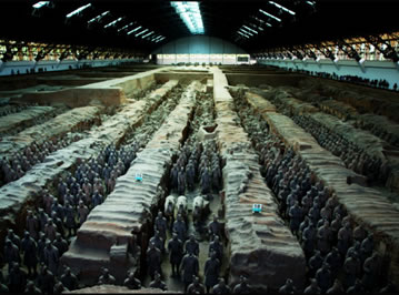 兵馬俑坑位于秦始皇帝陵?yáng)|側(cè)1.5公里處西楊村南,是秦始皇帝陵的陪葬坑。已發(fā)現(xiàn)三座,分別編為一、二、三號(hào)兵馬俑坑。三座俑坑占地面積達(dá)2萬(wàn)多平方米,內(nèi)有和真人、真馬大小相似的陶俑、陶馬近8000件。有車兵、騎兵和步兵等不同的兵種,排列整齊有序。