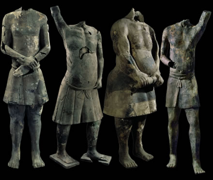 此套展品為秦代的陶器,出土于秦始皇帝陵K9901陪葬坑。一號(hào)百戲俑,殘高152.00厘米,右臂有刻劃文字“咸陽(yáng)親”。三號(hào)百戲俑,殘高172.00厘米。四號(hào)百戲俑,殘高152.00厘米。十九號(hào)百戲俑,殘高181.00厘米。1999年,考古人員在秦陵?yáng)|南部?jī)?nèi)外城垣之間的陪葬坑內(nèi),試掘出土了陶俑11件,它們上體裸露,下體著裳。動(dòng)作有直立狀、雙手卷衣狀、一手叉腰一手高舉、雙腿弓箭步、半跪狀等。