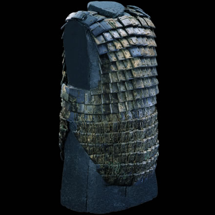 此展品為秦代的石器,通長(zhǎng)64.00厘米,出土于秦始皇帝陵K9801陪葬坑。鎧甲由前、后身甲和一對(duì)披膊組成,共有甲片380片。鎧甲的開合口位于右側(cè)肩、胸的交接處。