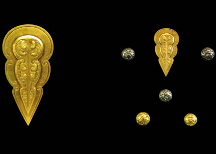 此展品為秦代的金器,金當(dāng)盧是秦始皇陵銅馬車馬頭部飾物。正面有細(xì)線勾畫出流云紋,中部有兩條蟠虺紋組成蟬狀紋樣,紋樣凸起呈淺浮雕形。當(dāng)盧背面印刻“十二”,鈕上有“上”銘文。