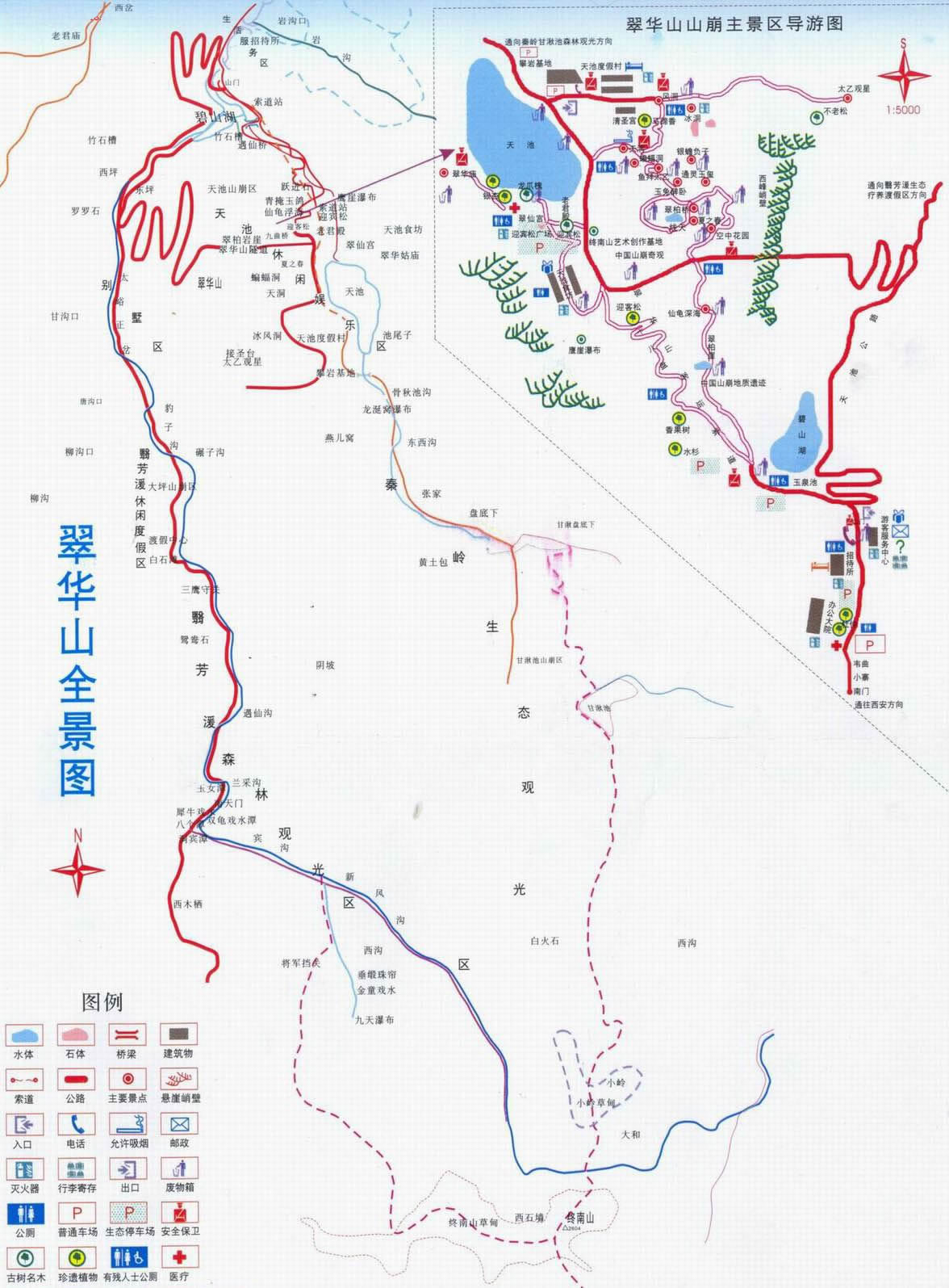 翠華山秀美的湖光山色和其國內(nèi)罕見的山崩地貌使翠華山以“終南獨秀”和“中國地質(zhì)地貌博物館”著稱。翠華山高峰環(huán)列,峭壁聳立,險不可攀,中有一天然水池,稱“天池”,又稱“太乙池”或“龍移湫”,池水面積約5萬平方米。湫池群山環(huán)峙,碧波蕩漾,清明如鏡,纖塵不染。池南的太乙殿,是舊時遇旱祈雨之所。還有呂公洞、黃龍洞,池北的冰洞、風(fēng)洞、八仙洞等。冰洞在盛夏仍堅冰垂凌,風(fēng)洞則四季寒風(fēng)颼颼。冰洞東南有飛流直下的瀑布。