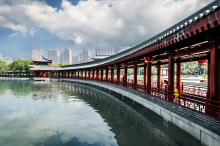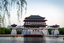 大唐芙蓉園,位于陜西省西安市雁塔區(qū)大雁塔東南側(cè),占地面積1000畝,其中水域面積300畝。大唐芙蓉園是在原唐代芙蓉園遺址以北,仿照唐代皇家園林式樣重新建造的,是中國第一個全方位展示盛唐風貌的大型皇家園林式文化主題公園。