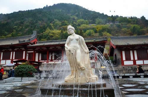 御湯遺跡:1982年4月,華清池內(nèi)基建時,在今“貴妃池”西側(cè)發(fā)現(xiàn)了古建筑基址,省文管會考古隊即開始發(fā)掘考證。用了3年多時間發(fā)掘了約4000平方米的面積,發(fā)現(xiàn)了一條長18米、寬5.1米的唐代蛇形水源通道和4座青石砌成的浴池,還有大殿基址4處,發(fā)現(xiàn)30多米長的石墻和兩處蓮花踏步,總長400多米的陶管水道,長50米的磚砌水道及建筑材料多件。1983年7月,考古工作者在溫泉總源北部發(fā)掘出一個東西長10.6米,南北寬6米,深1.5米。輪廓呈蓮花瓣形的浴池遺址,池底及四周均用青石鋪砌,池內(nèi)有兩層臺,池底南有兩個圓形水口。專家根據(jù)史籍記載華清宮的御池方位、形制、規(guī)模和發(fā)現(xiàn)的浴池四周的大殿基址和柱礎(chǔ)等,認為是唐玄宗使用的九龍殿蓮花湯。1984年10月在緊挨蓮花湯西北處,發(fā)掘出一個保存完好的海棠花形狀的浴池,東西長3.6米,南北寬2.9米,深1.26米,用青石砌成,池內(nèi)有二層臺階,池底正中有一圓形水口,做工考究,雕刻精細,專家認為是“海棠湯”,即唐玄宗御賜楊玉環(huán)的“貴妃池”。在蓮花湯西南還發(fā)掘出一個東西長5米,南北寬2.7米,深1.2米,用青石鋪砌的長方形浴池。據(jù)文獻記載推測,應(yīng)是“太子湯”。經(jīng)考證,這些古建筑遺存與史志書記載完全吻合,是一組較完整的唐華清宮建筑遺址,也是華清宮的中樞所在,為唐玄宗和貴妃游幸時活動的主要場所。期已經(jīng)全面整理,并仿唐形制,建成“唐華清宮御湯遺址博物館”供游人參觀。
