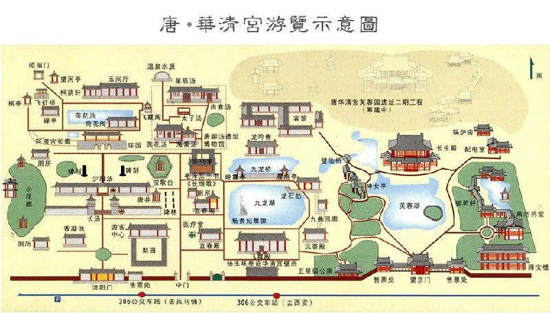 從文獻記載和野外的實際考察中,大抵可知華清宮的范圍是:南至驪山西繡嶺第一峰(即周烽火臺),北到今縣城北什字。東至石甕谷(寺溝)。西到鐵路療養(yǎng)院西側(cè)的牡丹溝。宮城(即羅城),南至山根,北到今縣城南什字,東至東窯村,西到游泳池。1967年新華書店在南什字西北角修建營業(yè)樓,發(fā)現(xiàn)了用青石砌成的宮城北墻的墻基。1981年春,城建單位在西街丁字形路北,也發(fā)現(xiàn)了同樣的北墻基。1982年冬于寺溝村南的山坡上探出東繚墻兩段。從調(diào)查和發(fā)掘所見遺跡及文獻資料所記,華清宮的建筑布局嚴謹,曲折縈回,規(guī)模宏大。唐玄宗以民脂民膏,建此豪華宮苑,供一己之歡娛,然曾幾何時,“漁陽鼙鼓”驚破了他的美夢。華清宮樓殿湯池,遂漸次破壞,自宋以至明清,其原有建筑已蕩然無存。記其遺跡,乃以彰我民族之文化,并以此為借鑒,建立一個新時代的風景旅游區(qū),供廣大人民群眾游覽。唐代華清宮充分利用了有利地形,使其成為一座結(jié)構(gòu)嚴謹、富麗堂皇的龐大宮殿建筑群。主要殿舍以溫泉為中心,構(gòu)成華清宮的核心。然后向山上和山下展開,利用地形特點,布設(shè)不同類型和用途的樓閣亭榭,同時還有青松翠柏、荔枝園、芙蓉園、梨園、椒園、東花園等分布其間,把整個華清宮妝扮得格外妖嬈。華清宮的建筑依山面水,鱗次櫛比,除宮城(羅城)外,還有繚墻環(huán)繞。繚墻之外,又羅列不少建筑,清乾隆《臨潼縣志》稱:“湯井殊名,殿閣異制,園林洞壑之美,殆非人境”。
