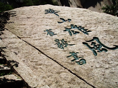 東峰頂生滿巨檜喬松,濃蔭蔽日,環(huán)境非常清幽。游人自松林間穿行,上有團(tuán)才綠蔭,如傘如蓋,耳畔陣陣松濤,如吟如詠,頓覺(jué)心曠神怡,超然物外。明書(shū)畫(huà)家王履在《東峰記》中談他的體會(huì)說(shuō):高大的檜松蔭蔽峰頂,樹(shù)下石徑清爽幽靜,風(fēng)穿林間,松濤涌動(dòng)更添一段音樂(lè)般的韻致,其節(jié)律,此起彼伏,好象吹彈絲竹,敲擊金石,多么美妙啊。