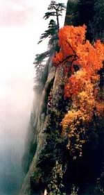 峰南側(cè)是千丈絕壁,直立如削,下臨一斷層深壑,同三公山、三鳳山隔絕。南峰由一峰二頂組成,東側(cè)一頂叫松檜峰,西側(cè)一頂叫落雁峰,也有說(shuō)南峰由三頂組成,把落雁峰之西的孝子峰也算在其內(nèi)。這樣一來(lái),落雁峰最高居中,松檜峰居?xùn)|,孝子峰居西,整體形象一把圈椅,三個(gè)峰頂恰似一尊面北而坐的巨人。明朝人袁宏道在他的《華山記》一書(shū)中記述南峰形象說(shuō):“如人危坐而引雙膝!