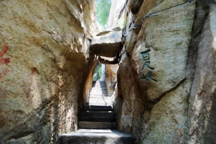 南天門(mén)石坊至朝元洞西,路依崖鑿出,長(zhǎng)20米,寬二尺許,為上段。
